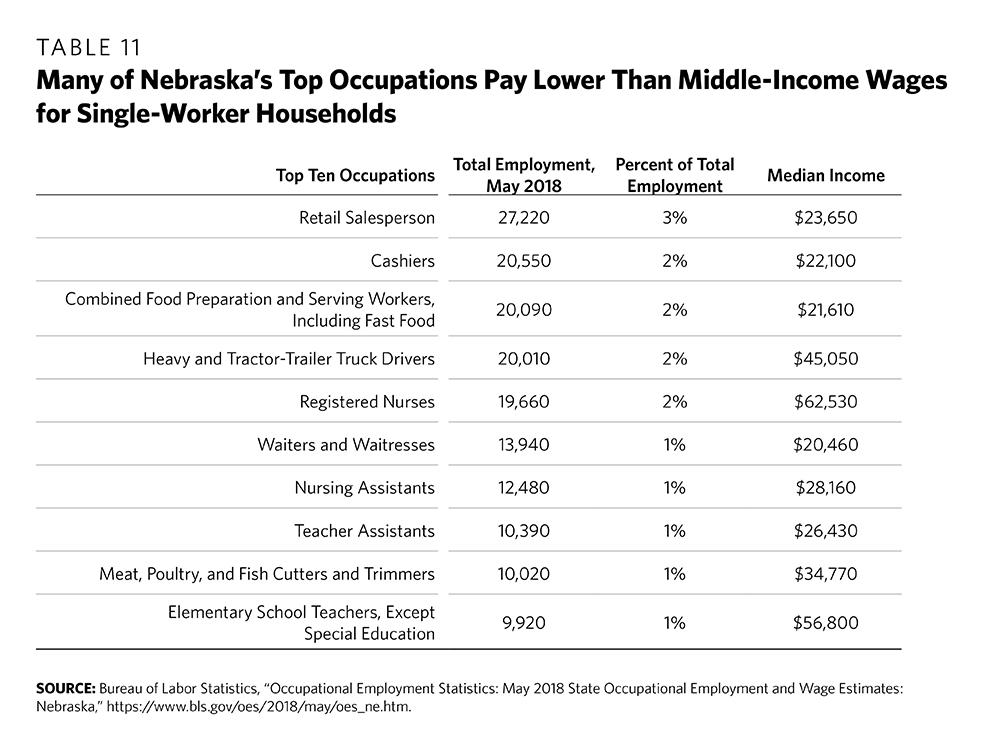 Meanwhile, service industry employment is expected to grow by 1.2 percent to 1.3 percent per year through 2022. Service industry jobs already account for eight of the top ten occupations in Nebraska, though many of these jobs pay less than middle-income wages (see Table 11). Thus, to attain middle-income status, many Nebraskans work more hours per week and hold multiple jobs (see Chapter 4).