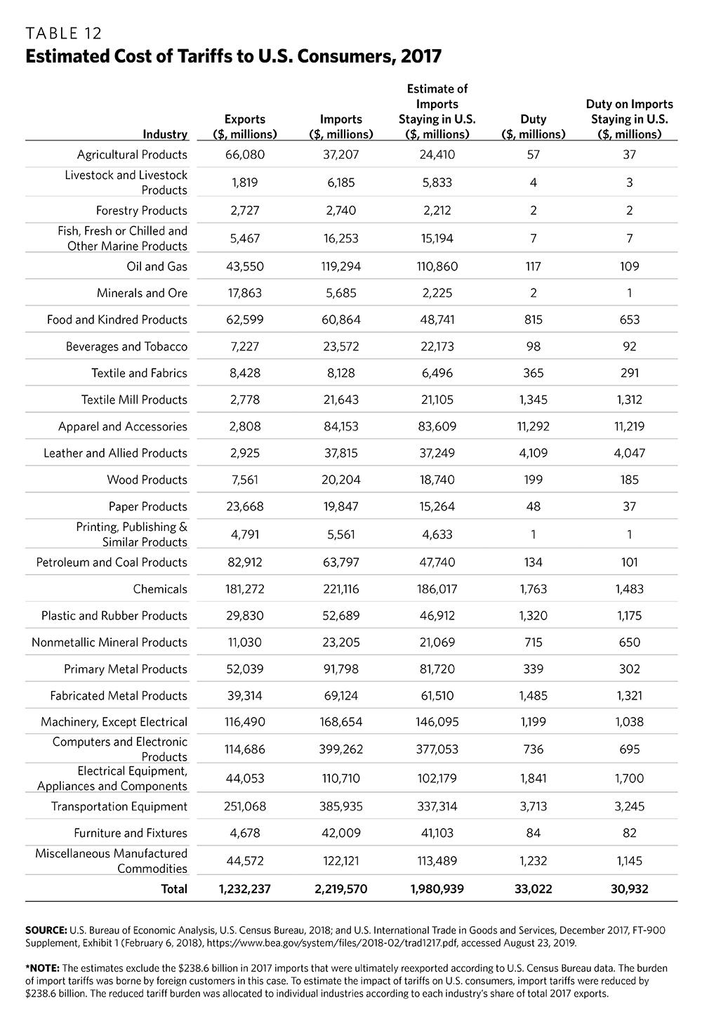 Table 12 shows the estimated total nominal cost of tariffs to U.S. consumers in 2017. The table implicitly assumes that tariffs on imported goods are borne by U.S. entities rather than the country of origin, as found by Amiti et al.22 The first two columns show the value of imports and exports of goods by industry in 2017, before the Trump administration imposed the 2018 and 2019 rounds of tariffs. It is useful to focus on pre-2018 tariffs so as to provide an example of the cost of long-term tariff policies for U.S. consumers because it is unknown whether tariffs introduced in 2018 and 2019 will be permanent.